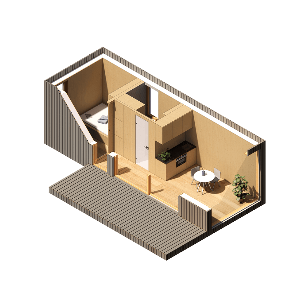 Das MIMA 3X9 bietet dir auf minimaler Fläche einen gut durchdachten Grundriss mit einem separaten Schlafraum. Ein Tageslichtbad und ein Wohnbereich mit Küche nutzen die 23qm Nutzfläche maximal aus. Das charakteristische Panoramafenster holt die Natur ins Innere und erzeugt einen erweiterten Wohnraum.