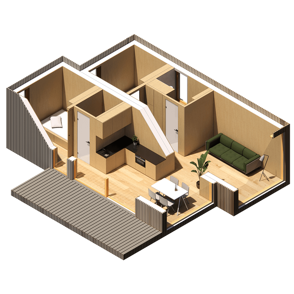 Das MIMA 6X9 erweitert den minimalen Gestaltungsansatz um ein weiteres Modul. Die 46qm Nutzfläche bieten Raum für zwei Schlafzimmer, ein Duschbad, einen Abstellraum und einen großzügigen Wohn-/ Essbereich. Maximal Minimal.
