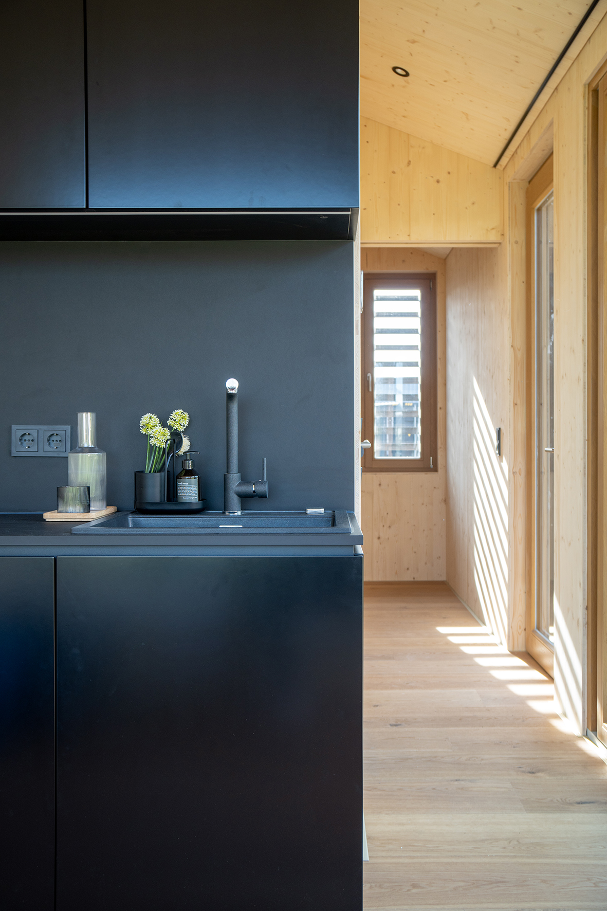 - Bei MIMA 6X9: Küche mit 4-Feld Induktionskochfeld, Backofen, Spüle mit Wasserhahn, Müllbehälter, Beleuchtung